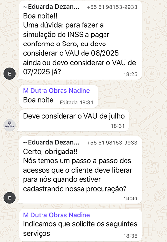 Durante a formação, você terá acesso a um canal direto de suporte para tirar dúvidas técnicas, através de um grupo no Whatsapp com minha equipe técnica e com alunos da formação, além de uma aula simulada de atendimento real, onde você entende como resolver casos de verdade com segurança.
