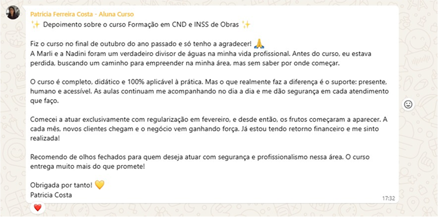 Porque foi criada por quem faz isso de verdade há mais de 30 anos. Marli Dutra já regularizou mais de 5.000 obras e gerou mais de R$ 6 milhões de economia de INSS de obras para seus clientes. Aqui você aprende um processo validado, prático, legal e com altíssimo valor de mercado. Sem teoria inútil e sem enrolação.
